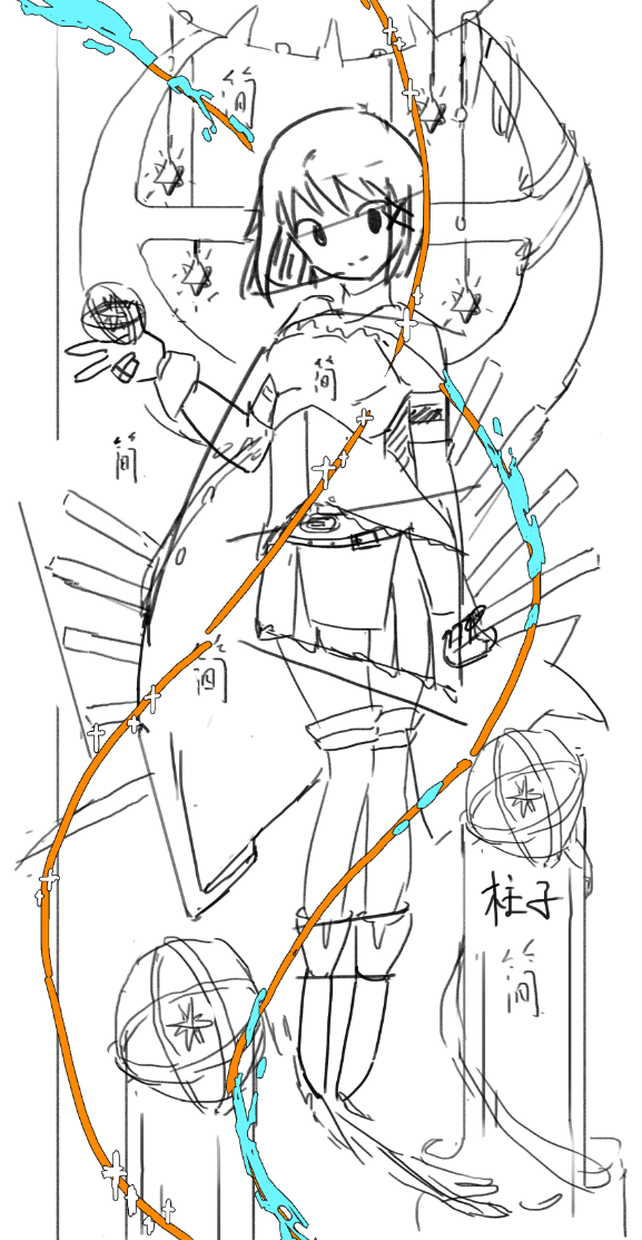 最开始画粗草就要安排自己画面的疏密对比,物件摆放,还有动态线的穿插关系,这也符合大中小长中短,疏密曲直的标准来,让每一个元素都是有意义的,而不是胡乱填充画面,多次从自己找到的参考物件元素物件尝试组合去符合穆夏的动态线,不过不用非常强硬的完全贴合,稍微有一些变化也是可以接受的,这一点其实我最开始是没有意识到的,非常感谢助教的指导。