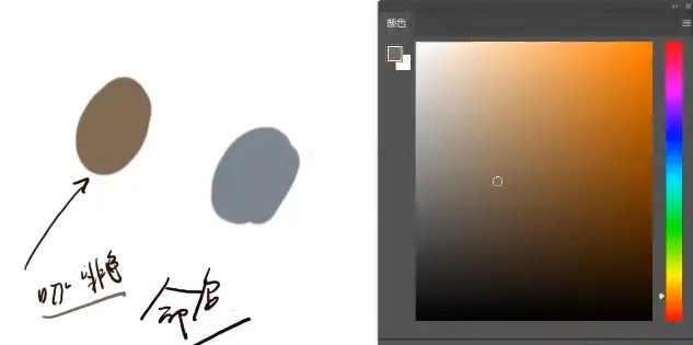 定下一个大概的区域色相、再选明度和纯度、比较明亮、比较饱和、这个时候已经简单的定位了一个差不多的颜色、不要纠结、直接画上去、对比之后发现和原图有区别